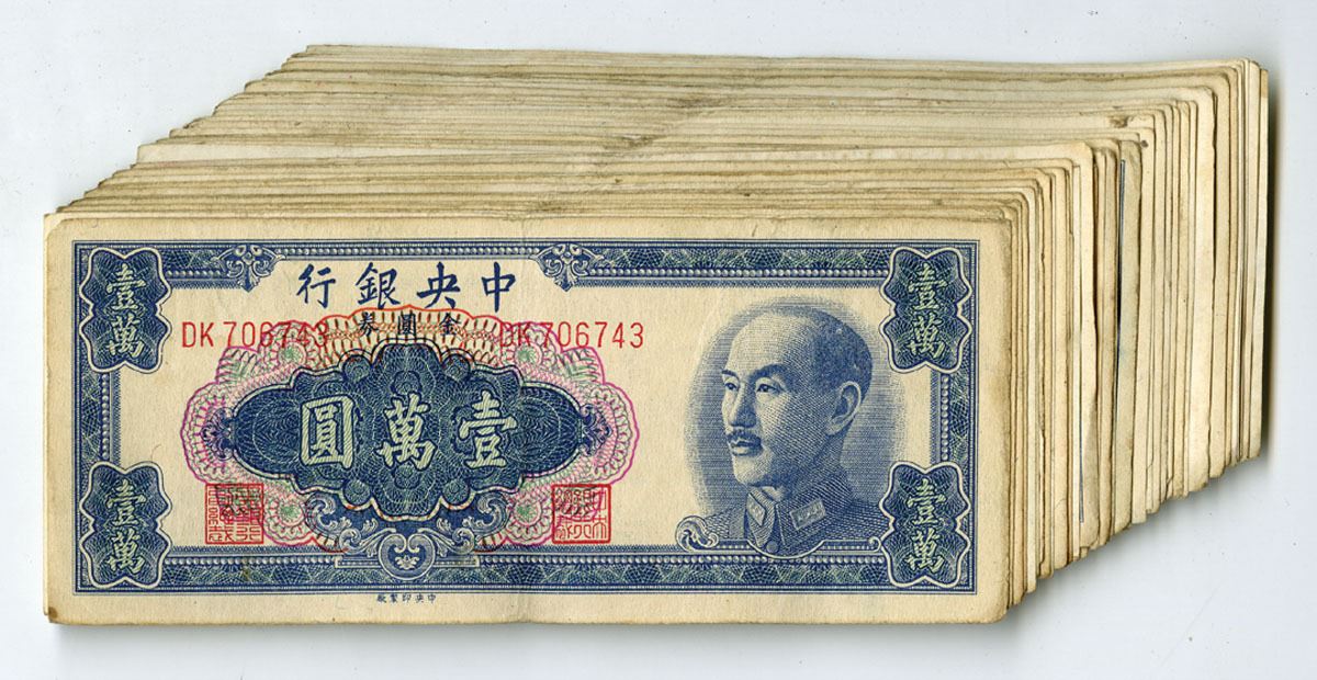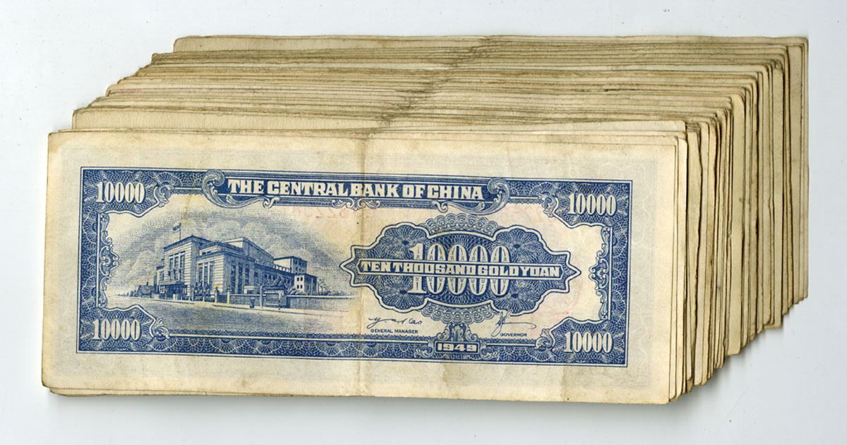 China, 1949. Lot of 40+ 10,000 Yuan, P-417, Group of Issued Banknotes, Blue on m/c underprint with CKS at right, Back is blue with bank building at left, VF to XF or better condition. (40+).
