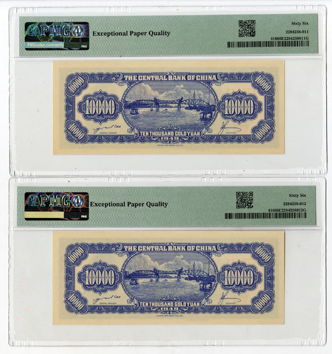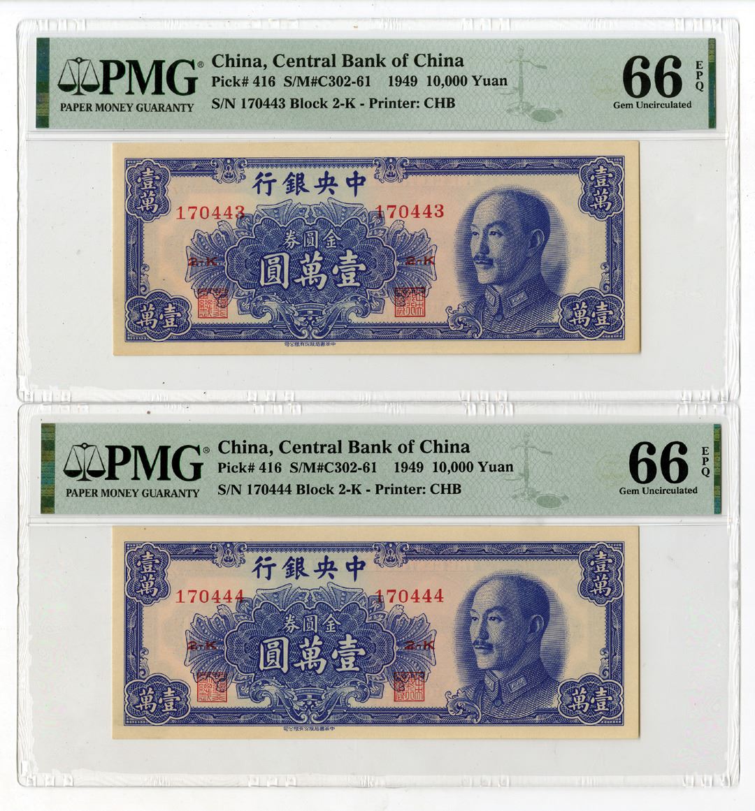 China, 1949. 10,000 Yuan, P-416 (2), S/M#C302-61, Pair of Issued Banknotes, Blue on pink and pale blue underprint with CKS at right, Backs are blue with bridge at center, S/Ns 170443 Block 2-K & 170444 Block 2-K, Both notes are PMG graded Gem Uncirculated 66 EPQ. (2). Sold "AS IS" no returns accepted.