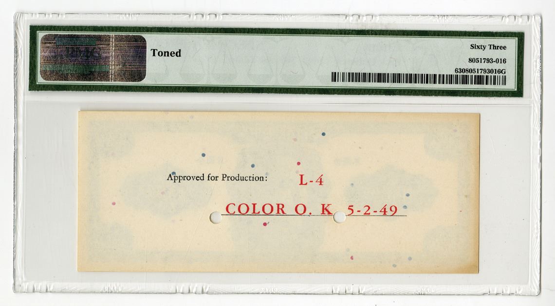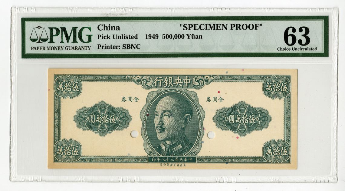 China, 1949, 500,000 Gold Yuan, P-Unlisted, (PMG designation 425Apef), Uniface front specimen. Approval banknote. Punched out cancels. No specimen, signatures or serial numbers. Back has "Approved for Production: L-4, Color O.K. 5-2-49". Rare note. No similar examples are listed in Pick. PMG graded Choice Uncirculated 63 with comment "Toned," SBNC.