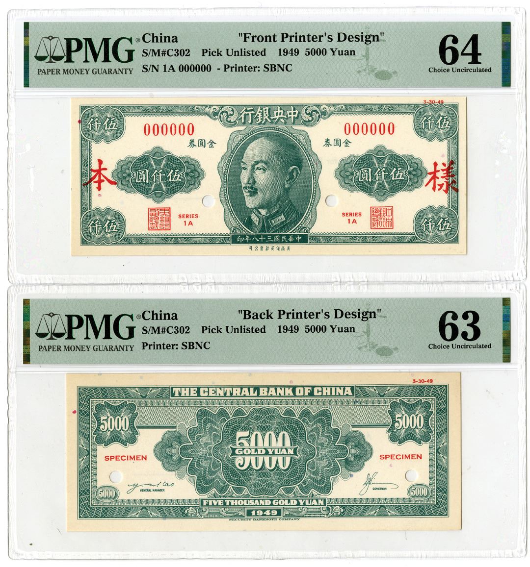 China. 1949. 5000 Yuan, P-Unlisted (PMG gave it the designation of S/M#C302). Uniface front and back specimen banknotes in green. CKS in center. Specimen overprint and POC. Front and back "Front and Back Printer's Designs". The Front is PMG graded Choice Uncirculated 64 and the back is Choice Uncirculated 63 with "toning" notation on back. Printer: SBNC. (2).