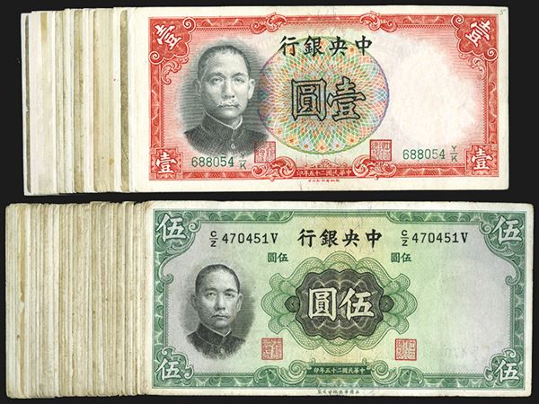 China. Central Bank of China. 1936 Issue. 1, 5 Yuan. P-212 (33); 218 (53). Sun Yat-Sen at left. Generally Fine, some with slight paper loss at edges. Over 85 pieces.