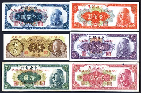 Lot of 7 items, 6 are banknotes stapled together on the top right corner and the American Bank Note Reference envelope they came in titled ìCentral Bank of China - Notes received from R.M. Strong, Jr. (Feb. 18, 1949)Ö..î and the list of the notes with serial numbers, all printed by the Central Printing Press, Shanghai. Five of the notes are dated 1948 with denominations 50cts to 100 Yuan and a 1949 Issue 100 Yuan. Condition varies between VF to CU. Scarce ABN Archival collateral.