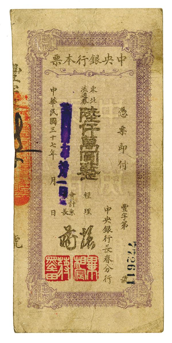 China, circulating bearer check for 60,000,000 Yuan = 10 Gold Yuan, P-449K, Fine+ condition.