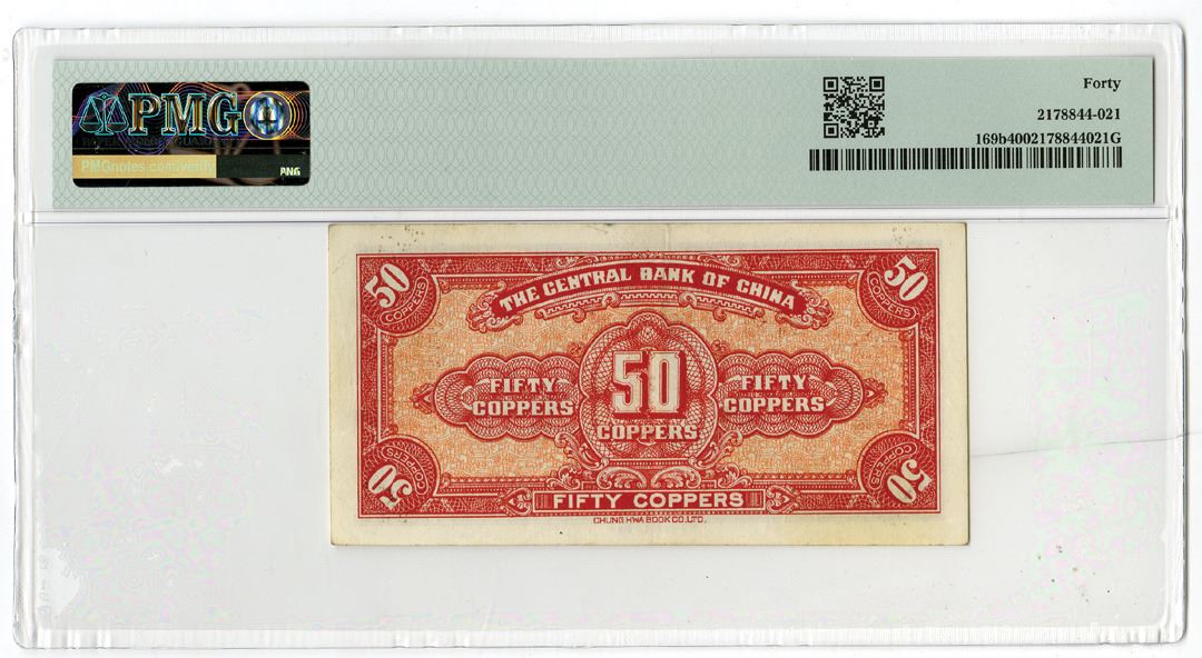 China, ND (1928). 50 Coppers, P-169b, S/M#C300-3, Issued Banknote, Lilac-brown on light brown underprint and red overprint, Pagoda at right, back red, S/N B380086, PMG graded Extremely Fine 40.