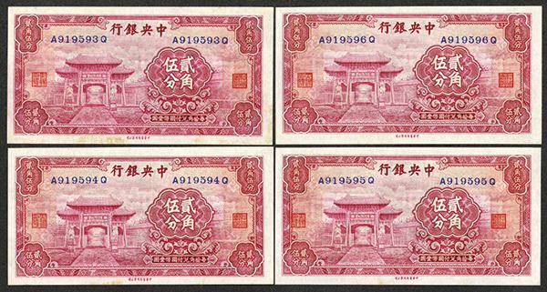 China, Lot of 4 Sequential notes, All are 25 cents, P-204 Issued banknotes, P'ai-lou Gate at left, red, back dark blue, All are Choice to Gem Uncirculated, CHB.