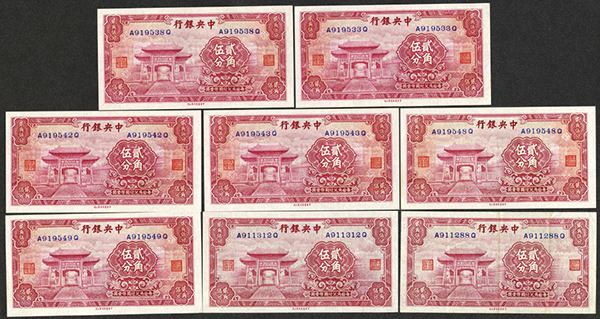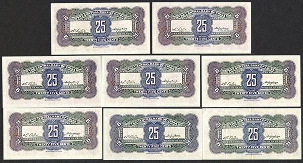 China, Lot of 7 notes, All are 25 cents, P-204 Issued banknotes, P'ai-lou Gate at left, red, back dark blue, 2 pairs are sequential, the rest mixed numbers, 6 out of the 7 notes are Choice to Gem Uncirculated, one note is VF, CHB.