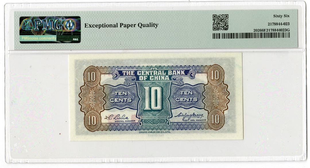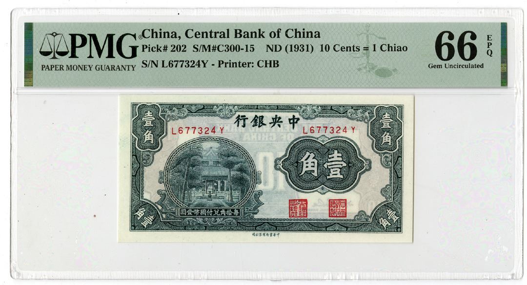 China, ND (1931). 10 Cents = 1 Chiao, P-202, S/M#C300-15, Issued Banknote, Green with temple behind trees at left, S/N L677324Y, PMG graded Gem Uncirculated 66 EPQ, Printer: CHB.
