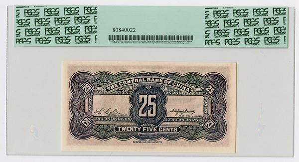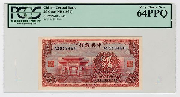 China, 25 cents, P-204a, issued banknote, Red, Commemorative Archway at left, back blue, S/N A281944H, PCGS Very Choice uncirculated 64PPQ, scarce note rarely seen this nice.