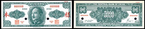 1949. 5,000 Gold Yuan. Series 00A. (PMG designated P-UNL5000pe) P-Unlisted. Uniface front and back specimen banknotes in green. CKS in center. Red Chinese specimen overprint, “00000” serial numbers and POC with back of each with blank “Approved for Production”. Face is PMG graded Gem Uncirculated 66 EPQ (Exceptional Paper Quality) and back is graded Choice Uncirculated 64 EPQ (Exceptional Paper Quality). Horizontal note.
