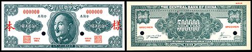 1949. 500,000 Gold Yuan. Series 00A. (PMG designated P-UNL500Kpe) P-Unlisted. Uniface front and back specimen banknotes in green. CKS in center. Red Chinese specimen overprint, “00000” serial numbers and POC with back of each with “Specimen” and control number. Face is PMG graded Gem Uncirculated 66 EPQ (Exceptional Paper Quality) and back is graded Choice Uncirculated 64 EPQ (Exceptional Paper Quality). Horizontal note. The back of the face has a serial number with star. The back of the reverse has “Color O.K. 5-2-(1949), SBNC. Rare high denomination essay banknote. The PMG census lists only three faces and 2 backs graded.