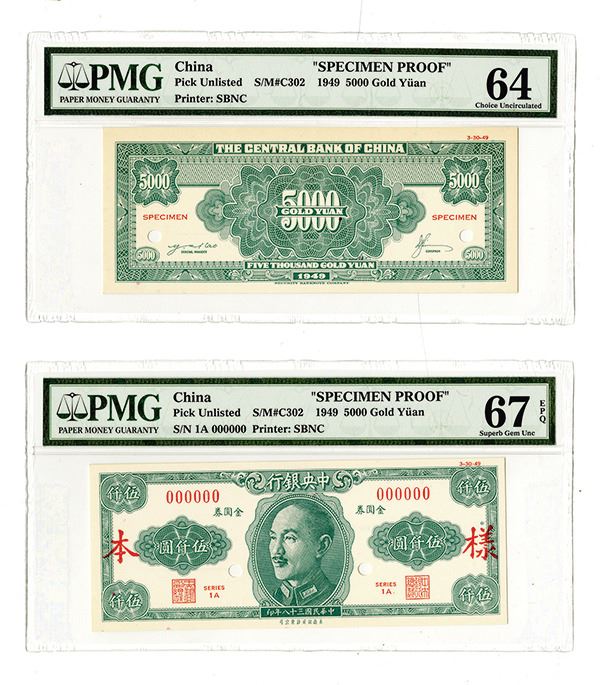 China. 1949. 5,000 Gold Yuan. Series 00A. (PMG designated P-UNL5000pe) P-Unlisted. S/M#C302-, Uniface front and back specimen banknotes in green. CKS in center. Red Chinese specimen overprint, Ò00000Ó serial numbers and POC with back of each with blank ÒApproved for ProductionÓ. Face is PMG graded Superb Gem Uncirculated 67 EPQ (Exceptional Paper Quality) and back is graded Choice Uncirculated 64 EPQ (Exceptional Paper Quality). Horizontal note.