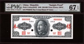 1949. 500,000 Gold Yuan. Series 00A. P-Unlisted. Uniface front and back specimen banknotes in green. CKS in center. Red Chinese specimen overprint, "00000" serial numbers and POC with back of each with "Specimen" and control number. Face is PMG graded "67 EPQ" Superb Gem Uncirculated, Exceptional Paper Quality and back is graded "66 EPQ" Gem Uncirculated, Exceptional Paper Quality. Horizontal note. Back has Specimen No.......*L. SBNC. Rare high denomination essay banknote.