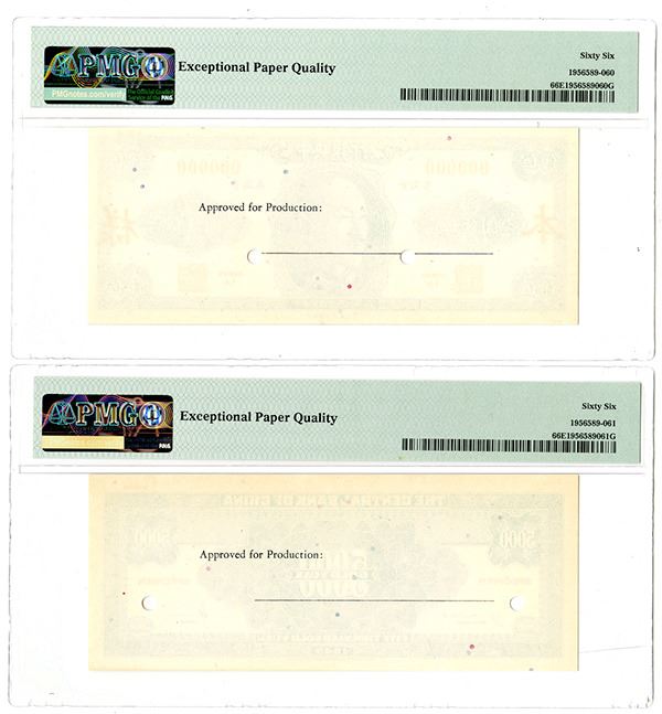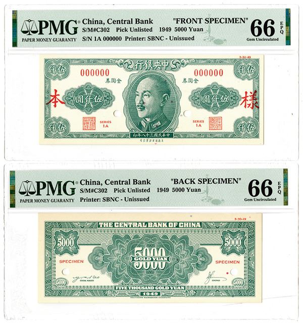 China. 1949. 5,000 Gold Yuan. No Series. P-Unlisted, S/M#C302. Uniface obverse and reverse specimen banknotes in green, CKS in center on face. The face and back are PMG graded Gem Uncirculated 66 EPQ, Horizontal note. Rare essay banknote in an amazing grade. SBNC.