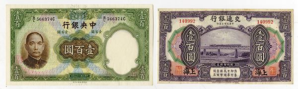 China, Lot of 2 notes, Includes 1936, Central Bank of China, 100 Yuan, P-220a, AU; and 1914, Bank of Communications, 100 Yuan, Shanghai Issue, P-120c, Choice VF. W&S and ABNC