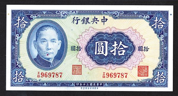 China. Central Bank of China. 10 Yuan, 1941. Sun Yat-Sen at left. SCWPM 239b. Signature 12. Security BNC. PMG 64.