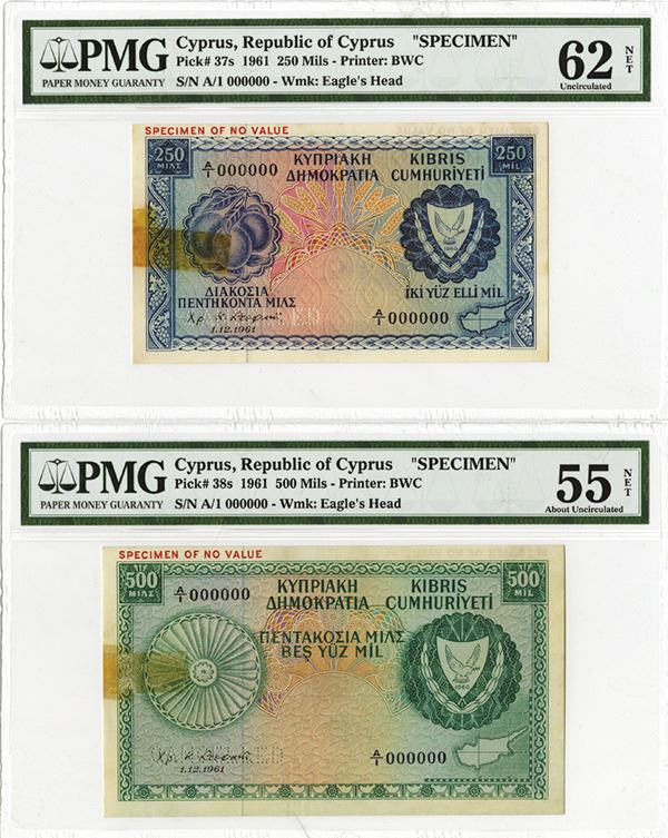 Cyprus, Lot of 2 notes, both are dated 1.12.1961, Includes 250 Mils, P-37s, PMG graded Uncirculated 62 NET and 500 Mils, P-38s, PMG graded About Uncirculated 55 Net, both with note of previously mounted and tape stains on left face. Both with pin-punched "Cancelled" and "A/1 000000" serial numbers, rare 1st issue specimen pair. BWC.