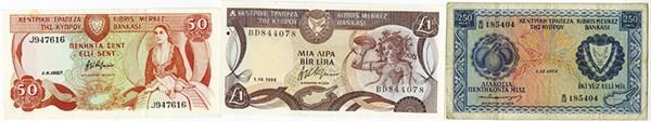 Cyprus, Lot of 3 notes, Includes 1964 first issue date, 250 mils, P-41a, Dark blue on light blue and m/c with fruit and arms, back blue; 1987, 50 cents, P-52, XF and 1996, 1 Pound, P-53d, Uncirculated to CU.