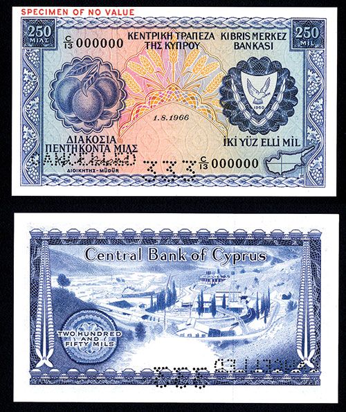 Cyprus, 1966, 250 Mil, P-41as Specimen banknote, Fruit at left, arms at right, Pin-punch “Cancelled-333” overprint, S/N C/13 000000, Gem Uncirculated condition. BWC (without imprint).