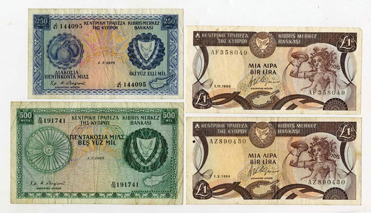 Cyprus, 1968-94. Lot of 4 Issued Banknotes, Includes: 250 Mils, P-41b, 1973; 500 Mils, P-42a, 1968; 1 Pound, P-53a & P-53c. Notes range from Fine-VF condition. (4). Sold "AS IS" no returns accepted.