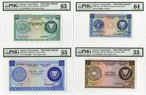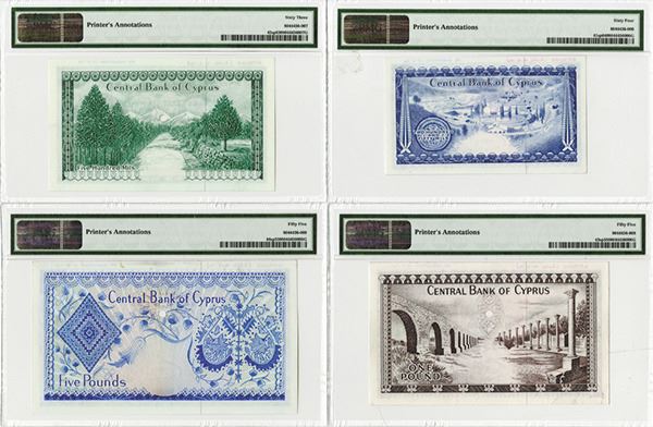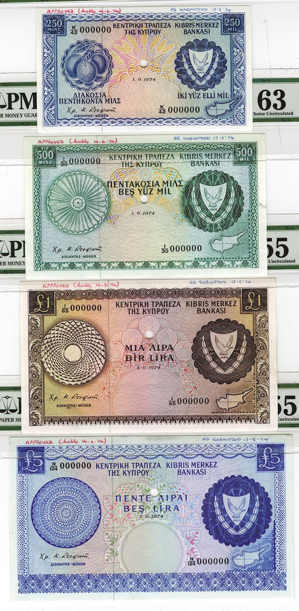 Cyprus, Lot of 4 notes, all are dated 1.6.1975, all with archival notations on top margins "ApprovedÉ.14-6-74" and "As submitted 17-5-74", Includes 250 Mils, P-41sp (specimen/proof), PMG graded CU 64; 500 Mils, P-42sp, PMG graded CU 63; £1 Pound, P-43sp, PMG graded AU55 and £5 Pounds, P-44sp, PMG graded AU 55. All with POC's and "000000" serial numbers, Rare approval quartet. BWC.