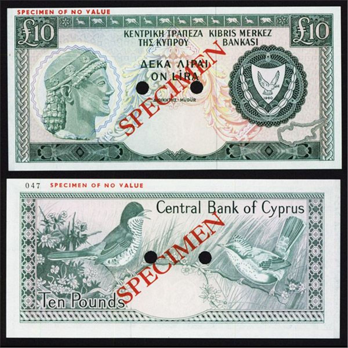 Cyprus, ND (ca.1977), 10 Pounds, P-48s, Specimen, Dark green on m/c but it is listed as Dark green and blue-black on m/c, Arms at right bust at left, back with local Cyprus birds, No date, Serial number or overprints other than SPECIMEN in red, POC's, Top left margin has SPECIMEN OF NO VALUE, Choice to Gem Uncirculated condition with exceptional paper quality. Rare as specimen. BWC, no imprint.
