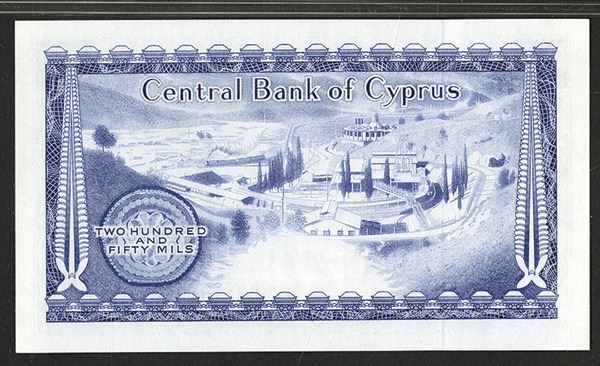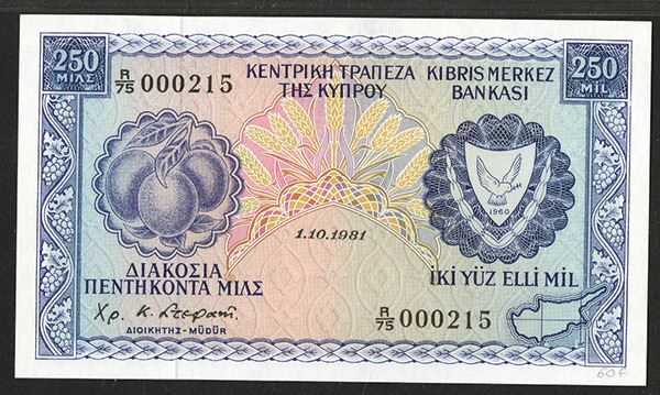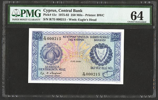 Cyprus, 1.10.1981, 250 Mils, P-41c, Issued, Blue on m/c, fruit left, arms right, back blue. PMG graded Choice Uncirculated 64.