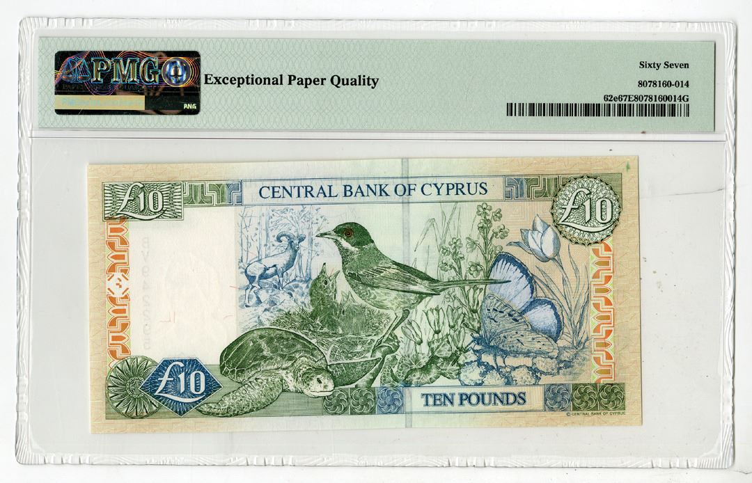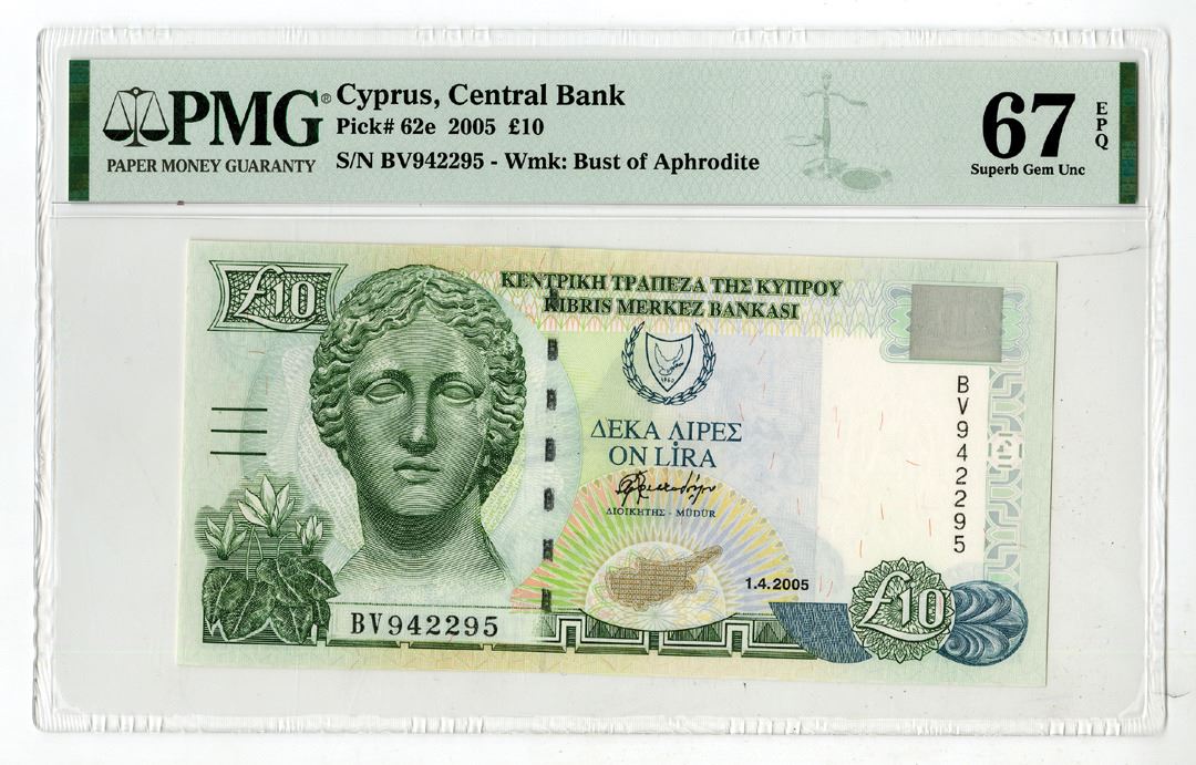Cyprus, 2005. 10 Pounds, P-62e, Issued Banknote, Olive-green and blue-green on m/c underprint, Marble head of Artemis at left and arms at upper center, S/N BV942295, PMG graded Superb Gem Uncirculated 67 EPQ, F-CO.