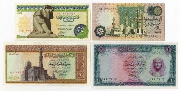 Egypt. Lot includes 1 Pound, 1961, P-37a, AU; 1 Pound, 1968, P-44a, AU; 25 Piastres, 1967, P-42, Choice AU-Unc; and 50 Piastres, 1980, P-55, XF. All with prefix 1.