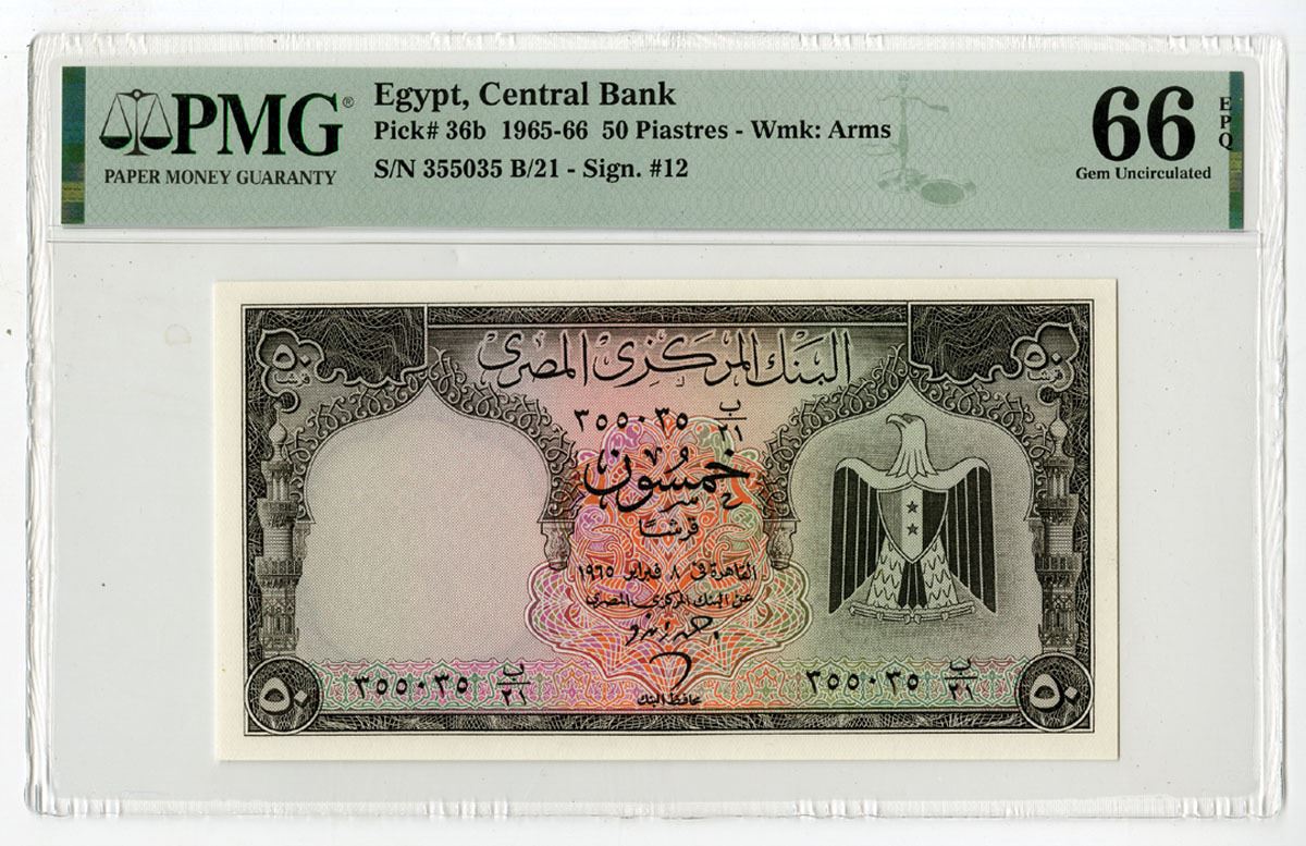 Egypt, 1965. 50 Piastres, P-36b, Issued Banknote, Gray on m/c underprint, U.A.R. arms at right, Back is black, Signature #12, S/N 355035 B/21, PMG graded Gem Uncirculated 66 EPQ.