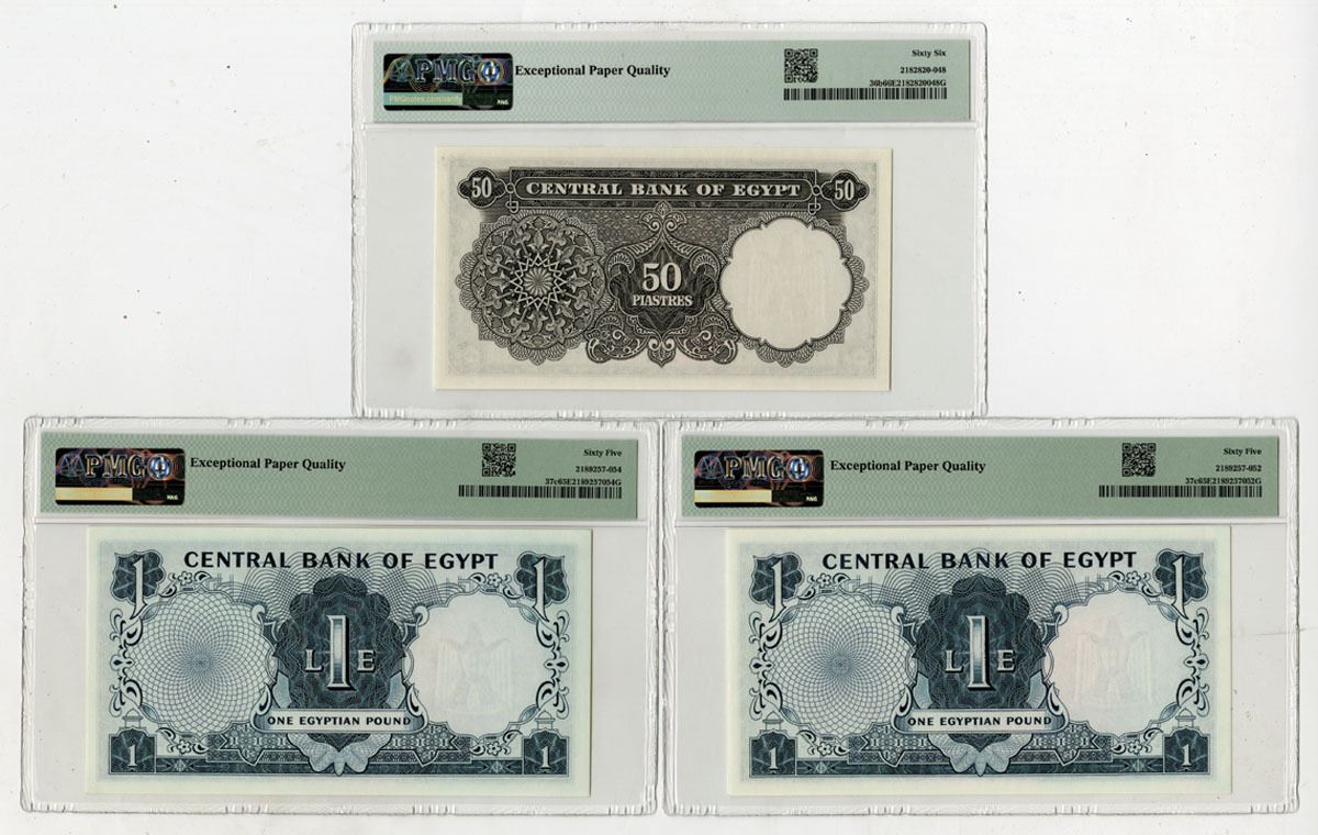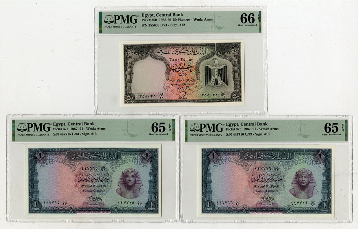 Egypt, 1965-67. Lot of 3 Issued Banknotes, Includes: 50 Piastres, P-36b, Gray on m/c underprint, U.A.R. arms at right, Back is black, Signature #12, S/N 355035 B/21, PMG graded Gem Uncirculated 66 EPQ; 1 Pound, P-37c (2), Sequential Pair, Blue-green on lilac and m/c underprint, Tutankhamen's mask at right, Back is green, S/N C/93 447715 & C/93 447716, Both notes are PMG graded Gem Uncirculated 65 EPQ. (3). Sold "AS IS" no returns accepted.