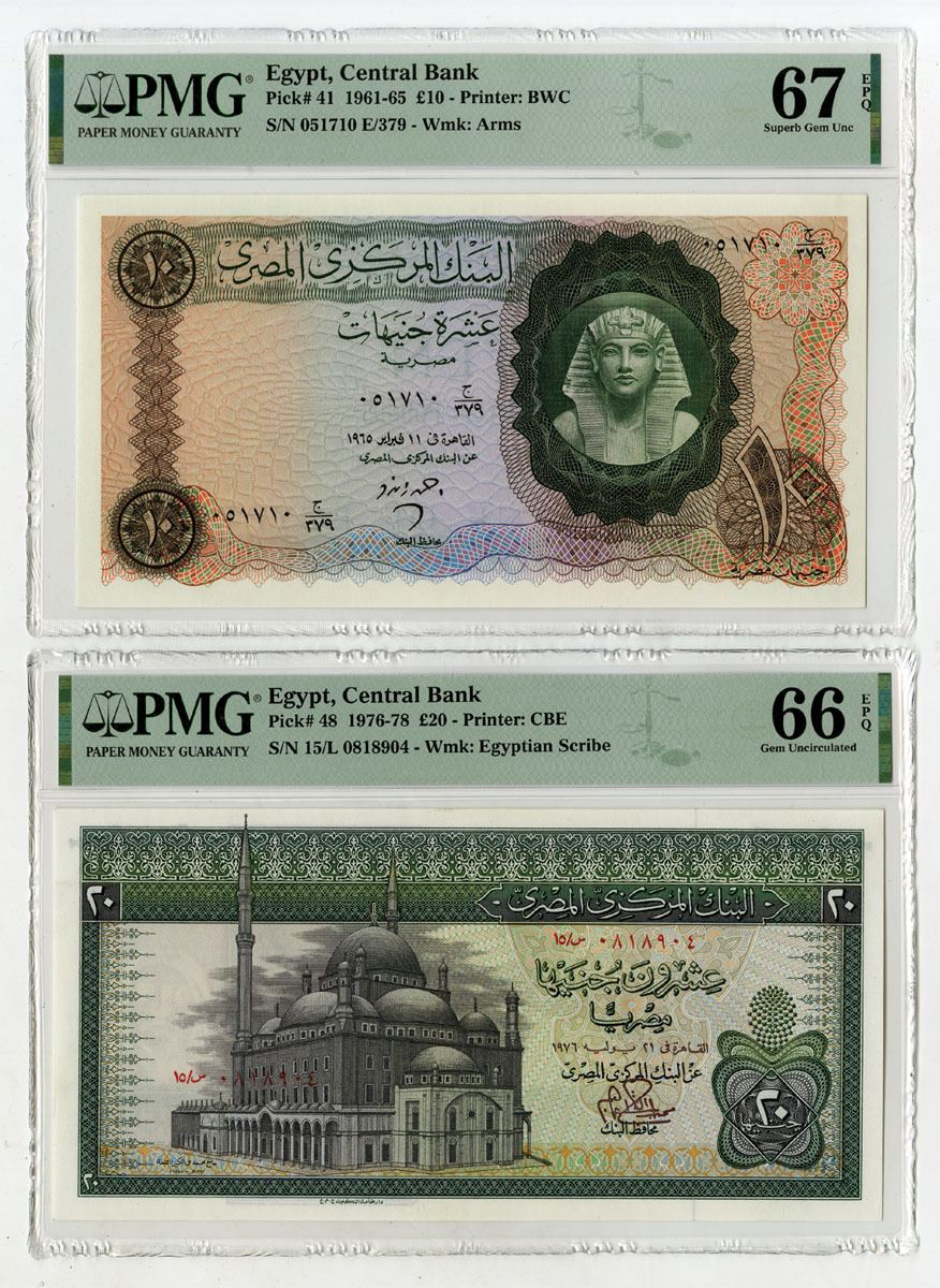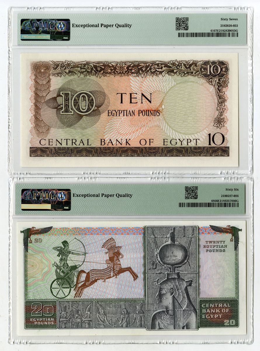 Egypt, 1965-76. Lot of 2 Issued Banknotes, Includes: 10 Pounds, P-41, Dark green and dark brown on m/c underprint, Tutankhamen's mask at right, Back is brown on m/c underprint, S/N E/379 051710, PMG graded Superb Gem Uncirculated 67 EPQ, Printer: BWC; and, 20 Pounds, P-48, Green and black on m/c underprint, Mohammed Ali Mosque at left, Back is green brown and m/c printing with Archaic war chariot at left and frieze at right, S/N 15/L 0818904, PMG graded Gem Uncirculated 66 EPQ, CBE. (2). Sold "AS IS" no returns accepted.