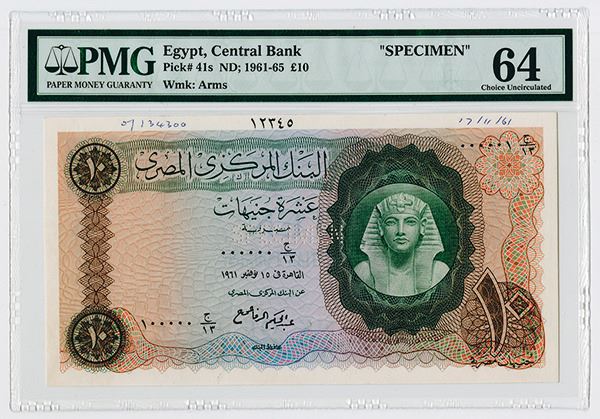 Egypt, 1961, £10, P-41s, Specimen banknote, Olive green on m/c, back brown on m/c, Pin-punch Specimen, S/N "000001 - 100000, Hand written date on top right margin "11-17-61 plus additional archival production numbers, PMG graded Choice Uncirculated 64 with note of printer's annotation, very attractive note and rare as a specimen. Only one other note has been offered out of 8 notes listed in the Track & Price Census at CU 64, none higher with most considerably in lower condition. This is the only Specimen offered since 2017 for this issue.