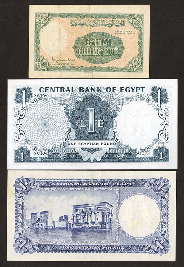 Egypt. Lot of 3 pieces, 1940, 10 Piastres, VF; 1960, 1 Pound, XF and 1967, 1 pound, CU. Tut mask on the Pound notes. 3 pieces.