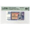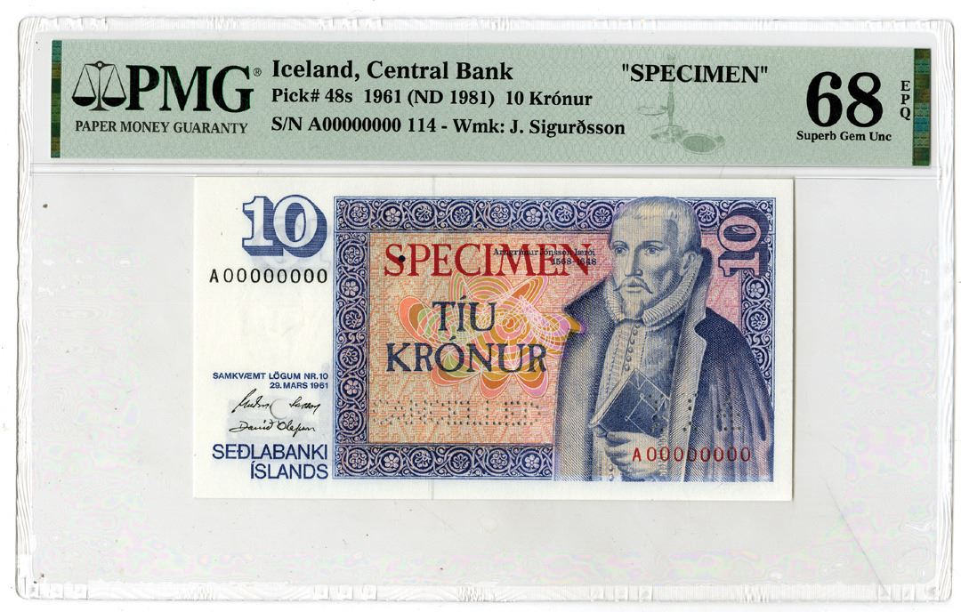 Iceland. 1961 (ND 1981). 10 Kronur, P-48s, Specimen banknote, Blue with multicolor underprint, S/N A00000000 114, Watermark: J. Sigurdsson, PMG graded Superb Gem Uncirculated 68 EPQ. This is the highest graded example out of 3 graded in the PMG census.