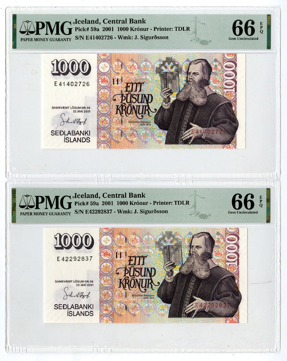 Iceland, 2001. 1000 Kronur, P-59a (2), Pair of Issued Banknotes, Red on m/c underprint with Bishop Brynjolfur Sveinsson at left, S/Ns E42402726 & E42292837, Both notes are PMG graded Gem Uncirculated 66 EPQ and were printed by TDLR. (2). Sold "AS IS" no returns accepted.