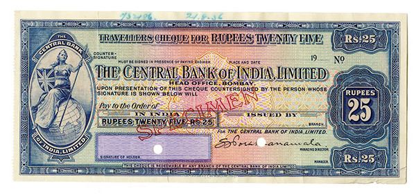 Bombay, India. 19xx (1936), 25 Rupees, P-Unlisted, Blue and m/c undertint, Seated allegorical Britannia at left sitting on globe, Ink notations on top that have run, red specimen overprint, POC's, blank back, XF condition due to folded lower right corner, Colorful and very attractive, BW&C.
