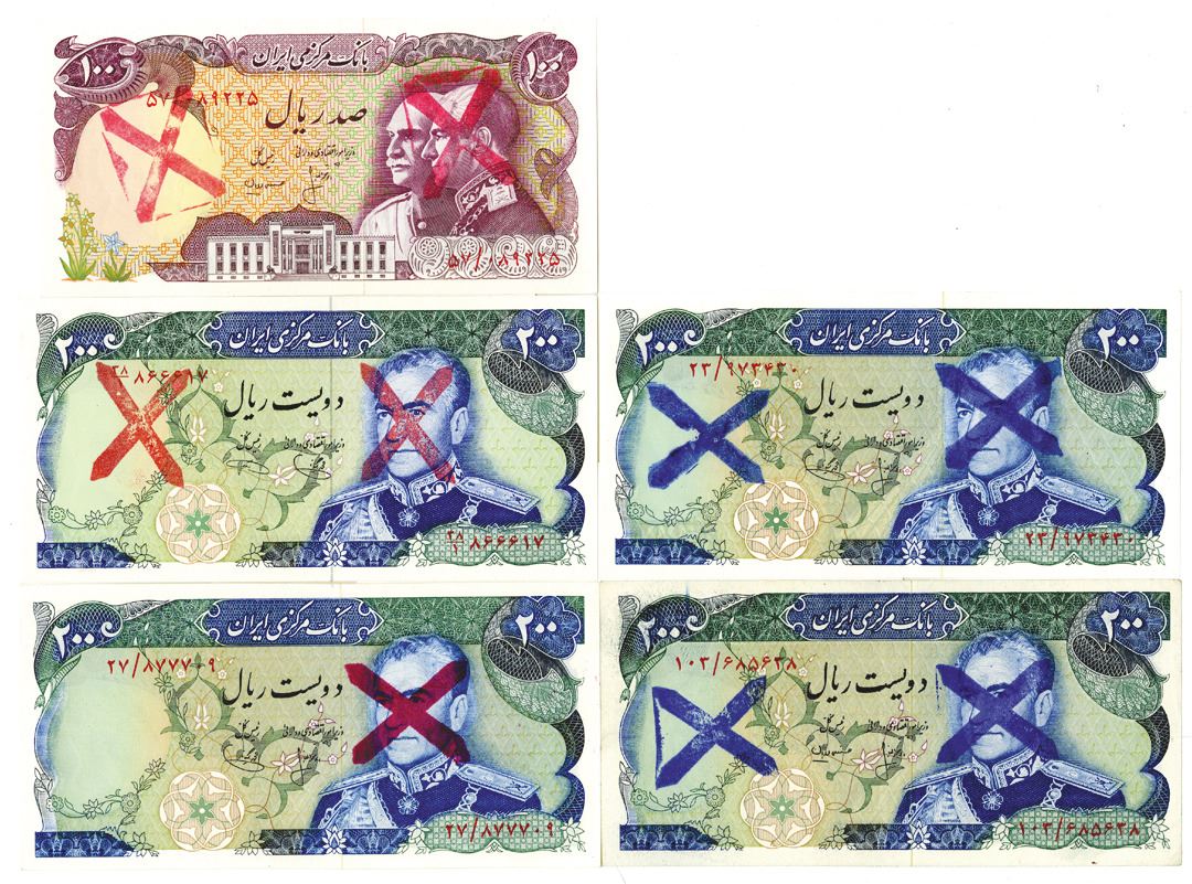 Iran. ND (ca. 1979-1980). 100 Rials and 200 Rials, cf. P-103; 108, issued banknote quintet, with unlisted blue and red "x" overprints obliterating Shah and watermark areas, Unc (5).