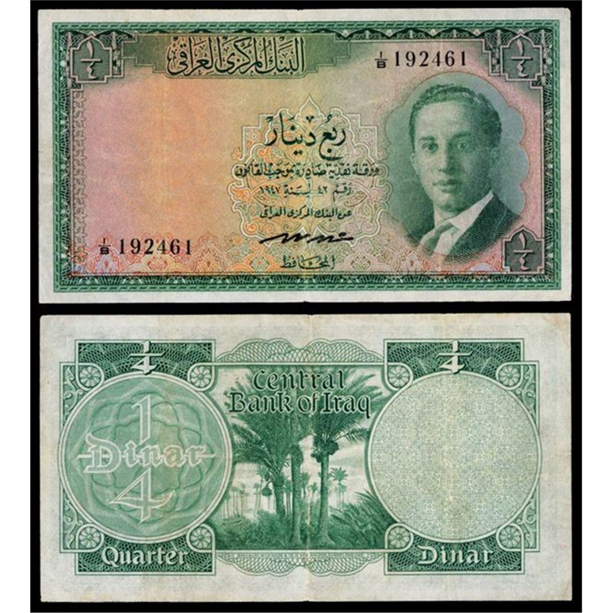Iraq, L.1947 (1959) , 1/4 Dinar, P-42, Issued banknote, Green on m/c, King Faisal II at right, Fine to VF condition. BWC.