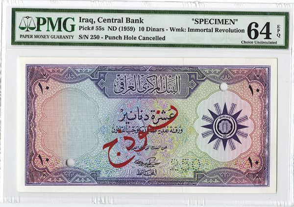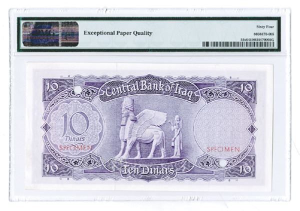 Iraq, specimen 10 Dinars, P-55s, perforated "250", overprinted SPECIMEN in Arabic, 2 POCs, PMG graded Choice Uncirculated 64 EPQ.