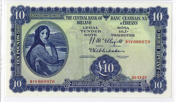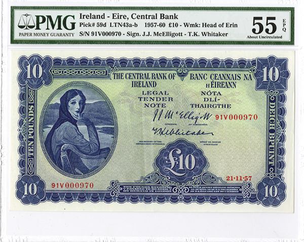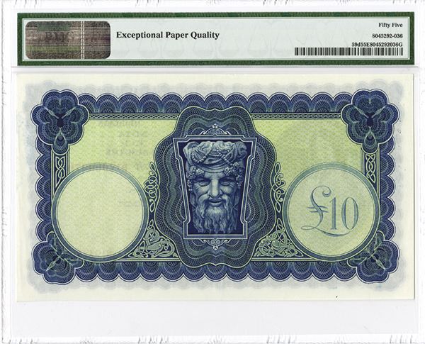 Ireland, 21-11-1957, £10, P-59d, LTN43a-b, Issued banknote, Blue on m/c, Signatures of McElligot and Whitaker, back blue on light green underprint, S/N 91V000970, PMG graded About Uncirculated 55 EPQ, attractive note with large even margins, appears CU.