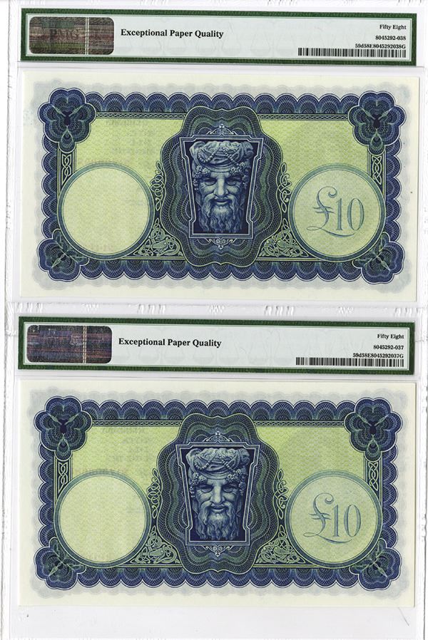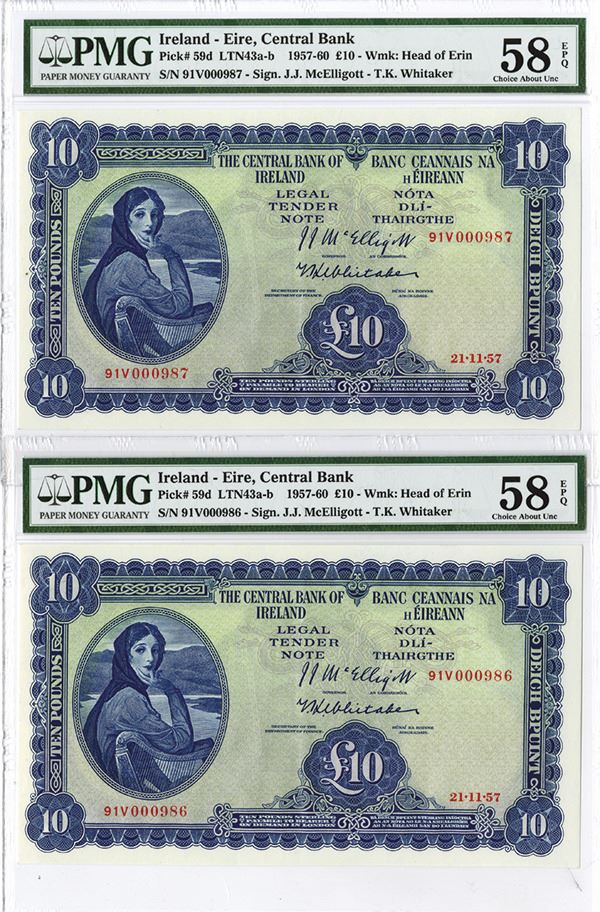 Ireland, Lot of 2 sequential notes, both are dated 21-11-1957, £10, P-59d, LTN43a-b, Issued banknote, Blue on m/c, Signatures of McElligot and Whitaker, back blue on light green underprint, S/N 91V000970, PMG graded About Uncirculated 55 EPQ, attractive note with large even margins, appears CU.