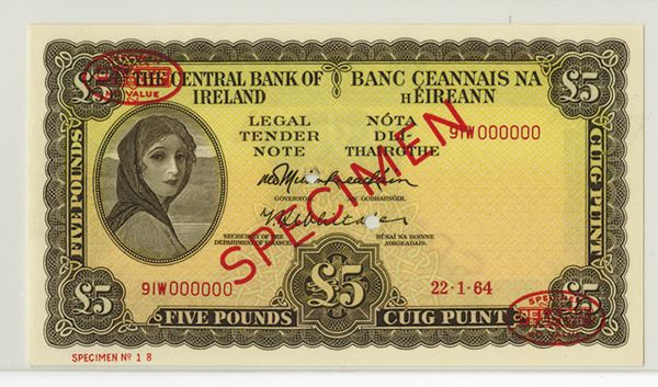 Ireland. 1964, 5 Pounds, P-65as, Specimen Banknote, Specimen and Oval TDLR overprints on top left and lower right corners, Minor Mounting remnants on back right margin that is difficult to view. PCGS graded Very Choice New 64, POC, TDLR.