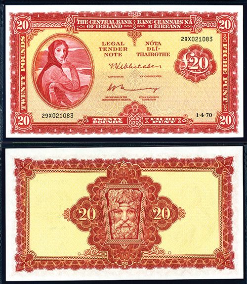 Ireland, 1-4-1970, 20 Pounds, P-67b LTN57a, Issued banknote, S/N 29X 021083, Whitaker and Murray signatures, No security thread, PMG graded Gem Uncirculated 65 EPQ, Amazing and attractive large format note that will be difficult to improve upon.