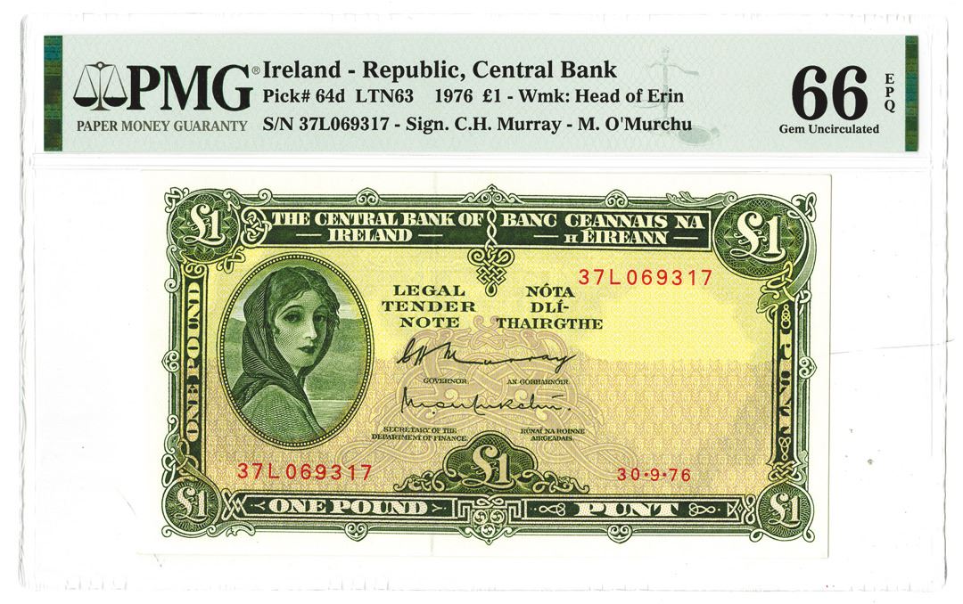 Ireland. Issued £1 Pound, 1976, P-64d LTN63. LTN63. S/N 37L 069317, PMG graded Gem Uncirculated 66 EPQ (Cert # 1956597-012). One of 2 sequential notes to be offered in this auction.