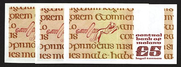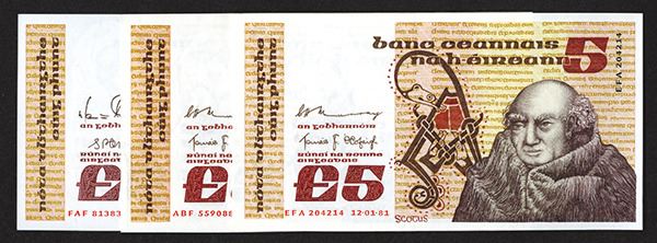 Ireland. 5 Pound. SCWPM 71c 12.1.1981, 16.7.1981 (VF+), e 12.8.1988 (first date of variety). Notes feature John Scouts Eriugena at right. All Choice Uncirculated except as noted. 3 pieces. (Arthur C. Matz Collection)