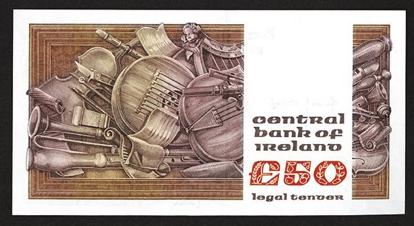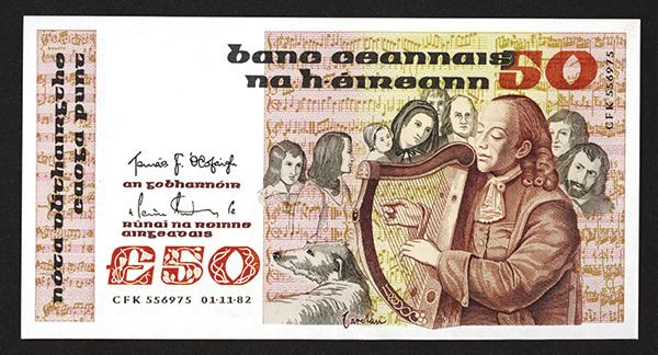 Ireland. 50 Pounds. SCWPM 75a. 1.11.1982. Turlough O'Carolan at right. Choice Uncirculated, the very slightest of surface dirt at top right margin corner mentioned for accuracy. (Arthur C. Matz Collection)