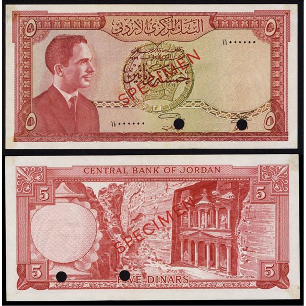 Jordan, L.1959 (1965), 5 Dinars, P-11s, Specimen, Signature 10, Red-brown on m/c underprint, Hussein on left, Back with Treasury of Pharaoh at Petra, Specimen overprint, POC's, Appears Uncirculated but there are very slight mounting marks on the back 4 corners and the security thread area on the right side of note has minor handling issues on the upper and lower margins, still very attractive and the note should grade AU to Uncirculated. No Printer imprint but possibly TDLR or BWC.