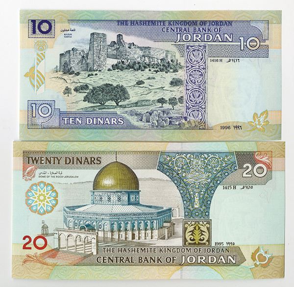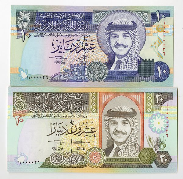Jordan, pair of issued notes, includes 10 Dinars, 1996, P-31a; and 20 Dinars, 1995, P-32a, both bearing matching 2-digit serial numbers AA 000036. Gem Uncirculated. TDLR.