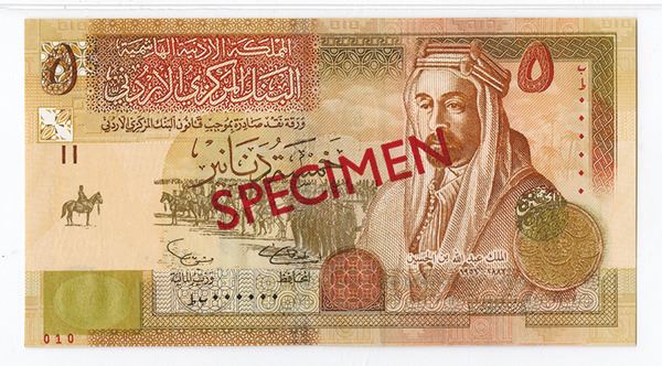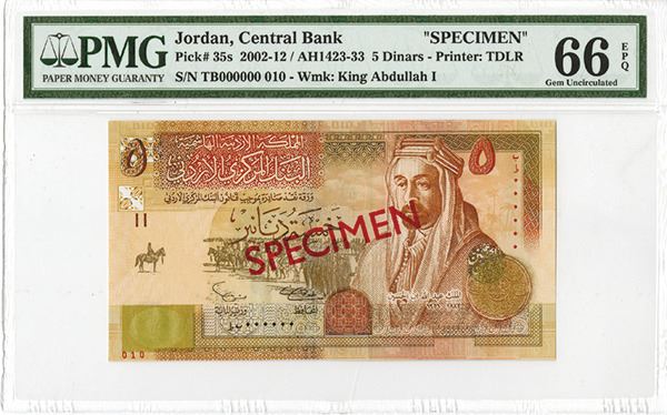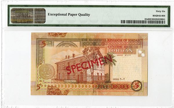 Jordan. Specimen 5 Dinars, 2002, P-35s, prefix BT, TDLR. PMG Gem Uncirculated EPQ.