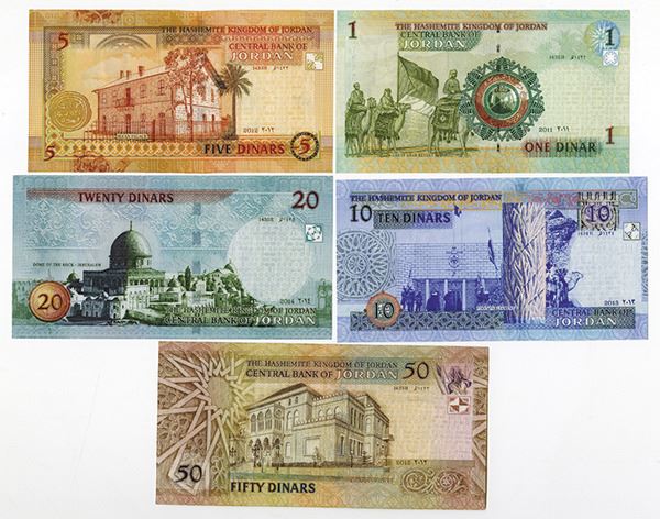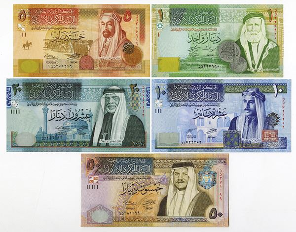 Jordan, type set of 5 replacement notes with ZZ prefix, includes 1 Dinar, 2011, P-34f; 5 Dinars, 2012, P-35e; 10 Dinars, 2013, P-36e; 20 Dinars, 2014, P-37e; and 50 Dinars, 2012, P-38g. Gem Uncirculated. TDLR.